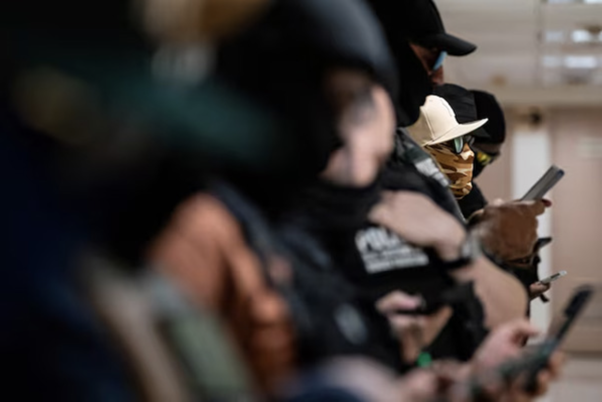 지난 7월 24일 연방 이민 단속 요원들이 맨하탄에 있는 이민법원에서 조치를 취하기 위해 대기하며 경계를 서고 있다. <로이터>